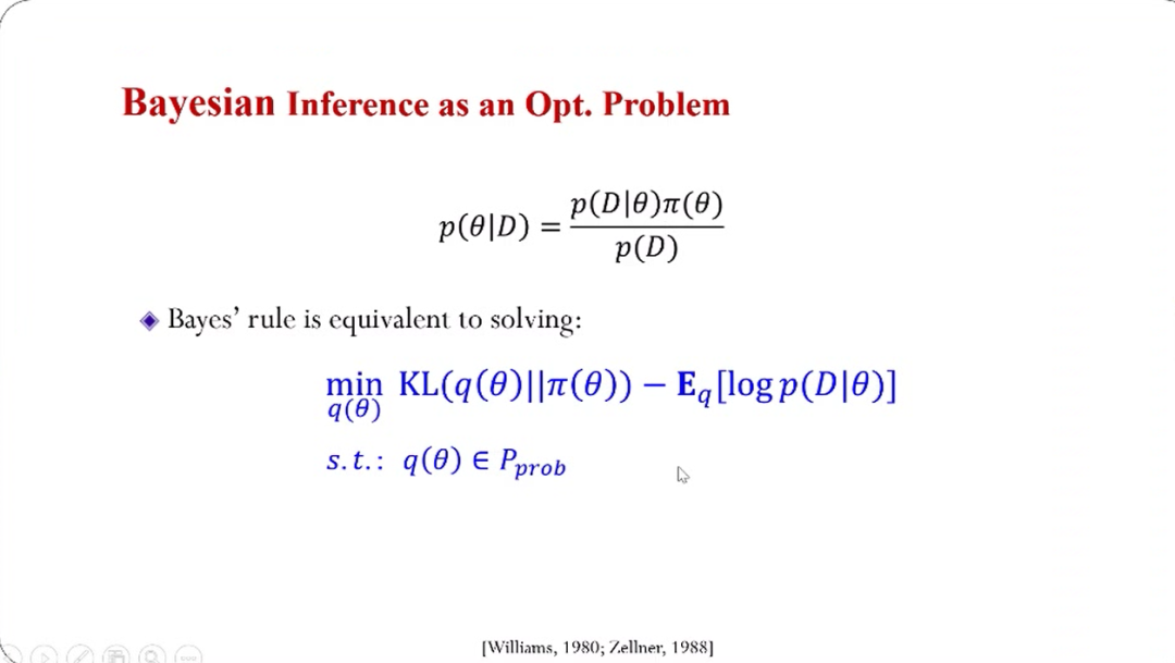 这种基于优化的解释,实际上在上世纪80年代就有统计学家提出过,E.T. Jaynes是比较有名的统计学家,对我们前面讲的优化解释做了一些comments,它给经典的贝叶斯提供了一个新颖的解释,可以让贝叶斯方法更广泛被应用,而且激发了新的发展。
