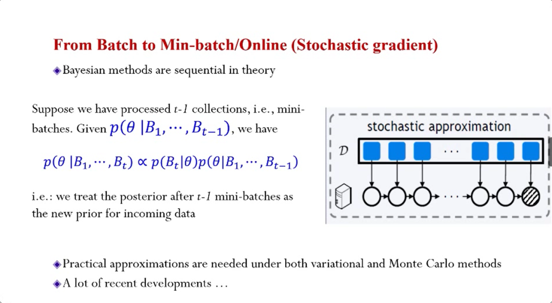 所以在大数据的场景下,大概有两个方面的发展,一是从处理Batch到处理Mini-batch,贝叶斯方法在理论上非常适合处理这种“流”数据或者是Online推断,由于每一步的后验分布并不能精确的计算,所以发展了许多近似方法。