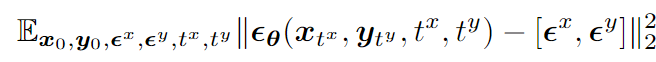 其中图片代表数据,图片代表加入到两个模态中的标准高斯噪声,图片代表两个模态加入噪声的大小(即时间),两者独立的从 {1,2,…,T} 中采样,图片为噪声预测网络,同时预测两个模态上的噪声。