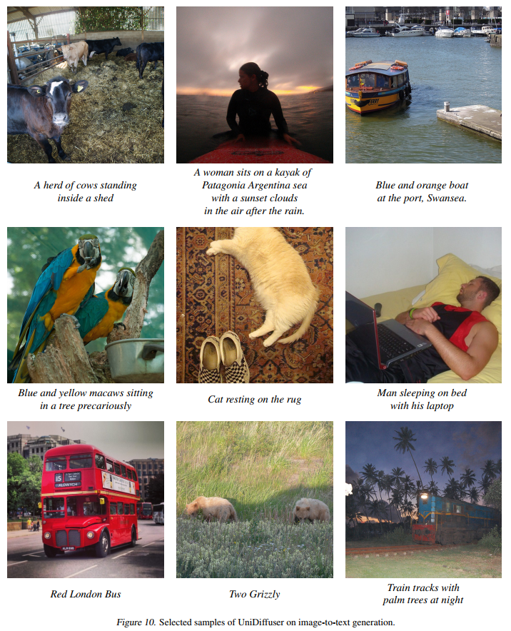 如下的图 10 展示了 UniDiffuser 在图到文上的效果: